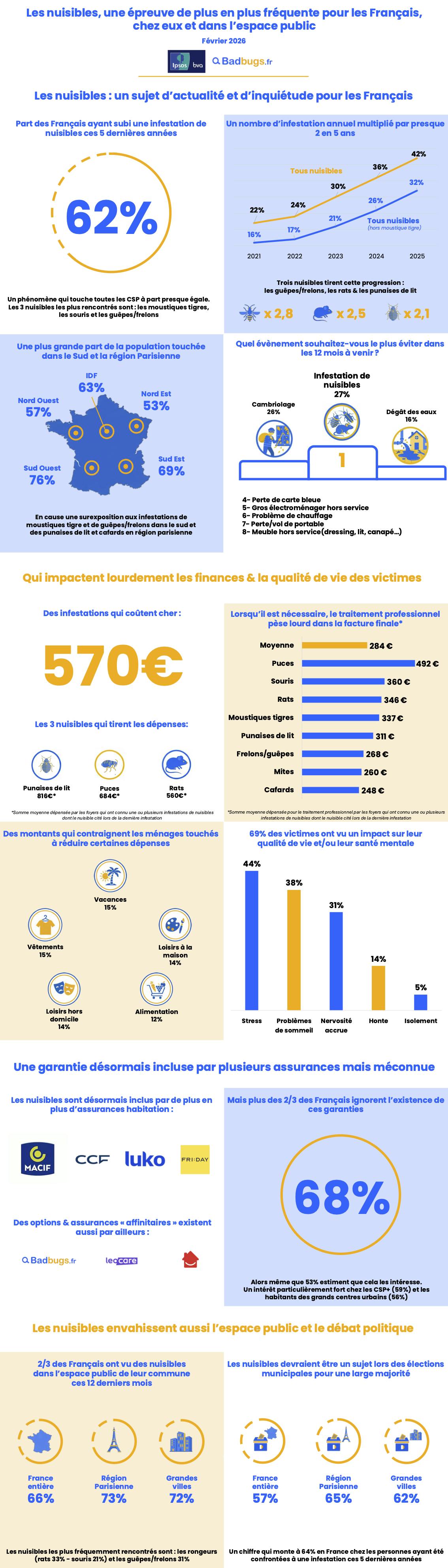 Badbugs.fr, première plateforme de mise en relation entre professionnels et particuliers confrontés aux nuisibles, publie aujourd’hui son rapport IPSOS : « Les nuisibles, une épreuve de plus en plus fréquente pour les Français, chez eux et dans l’espace public ». Menée auprès de 1 000 personnes, cette étude révèle que 62 % des Français ont été confrontés à une infestation au cours des cinq dernières années, un chiffre qui a doublé en seulement cinq ans. Les infestations de nuisibles (rongeurs, punaises de lit, cafards) arrivent désormais en tête des situations que les Français souhaitent éviter dans les 12 mois à venir, devant les cambriolages, les dégâts des eaux ou encore la perte de carte bancaire.